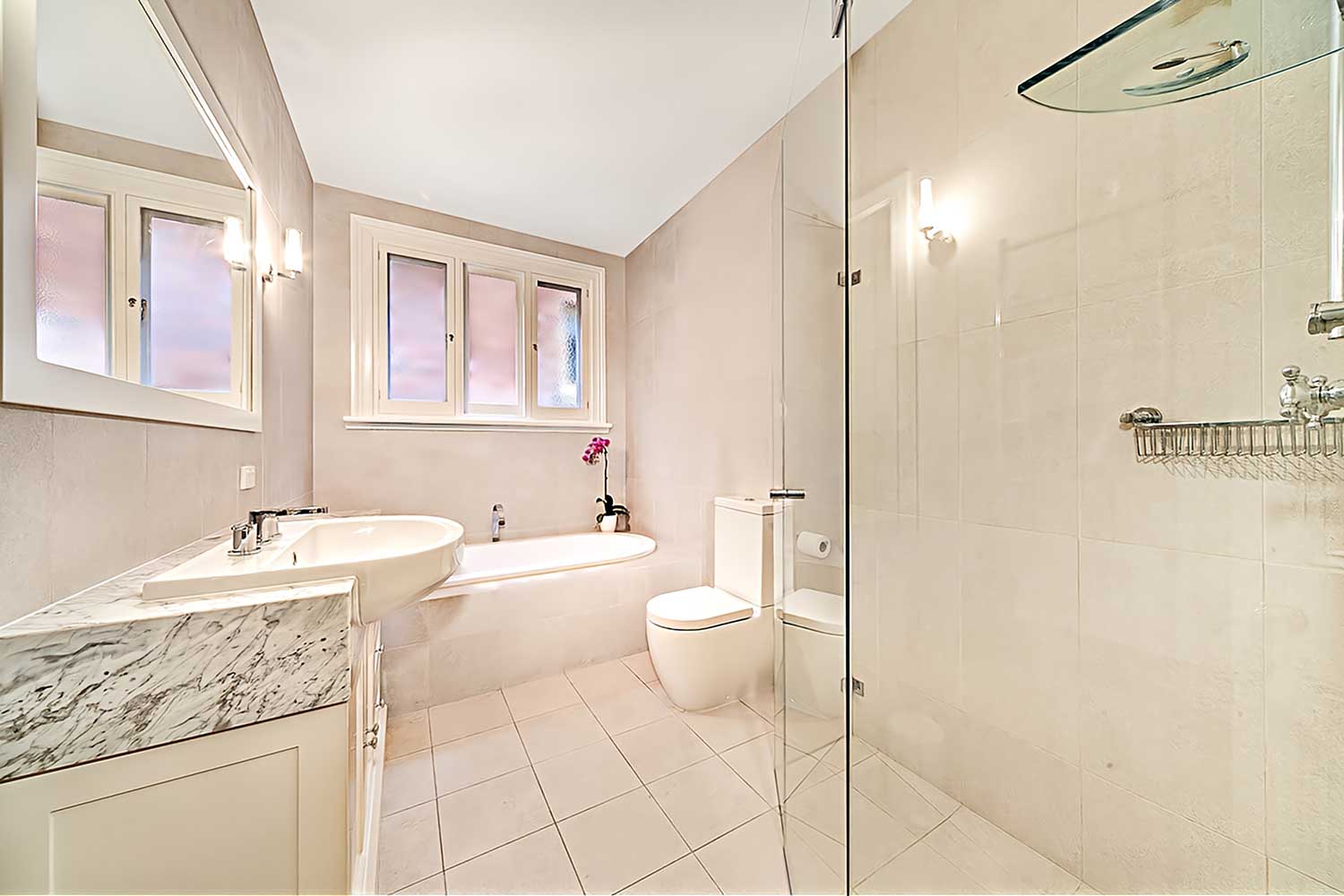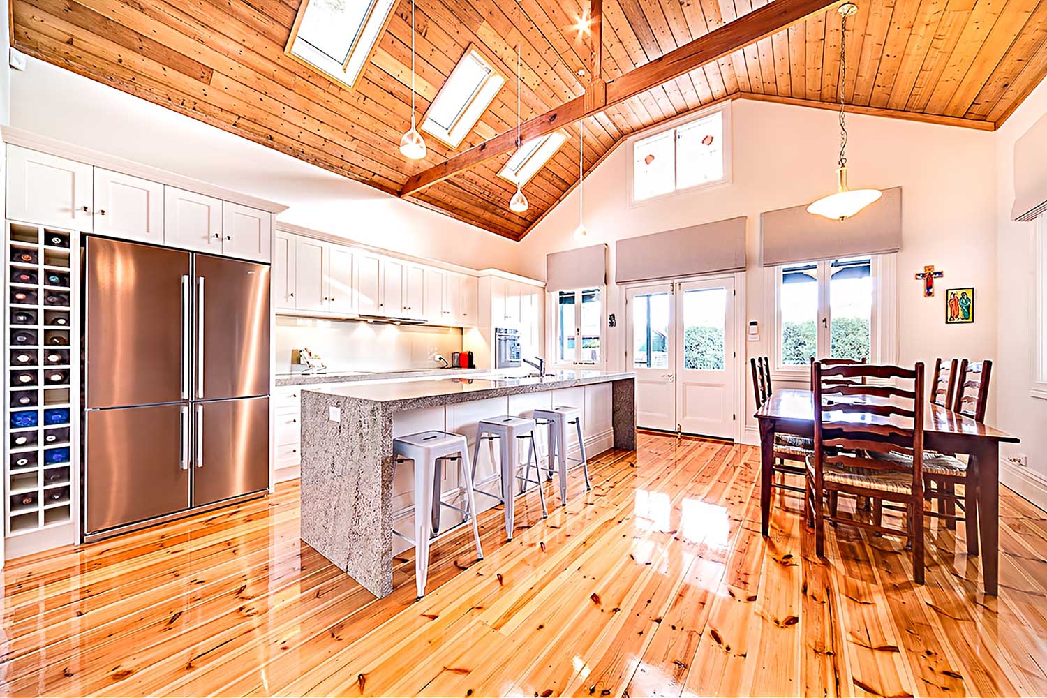 This house renovation comprised an extension and reinstatement in Edwardian style. An impressive new kitchen is the highlight and centre-piece with french doors and granite island bench on baltic pine floorboards bathed in natural light through the skylights with integrated motorised blinds. New modern bathrooms with marble tiles and custom joinery to accommodate heated towel rails and new window.